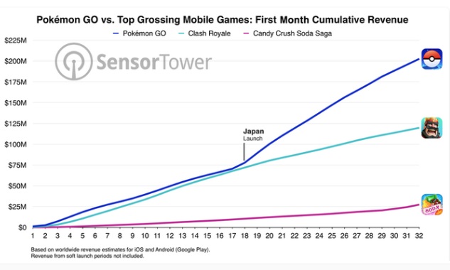 포켓몬고 게임의 매출규모는 히트친 게임 크래시로열이 출시 이후 한달 만에 거둬들인 매출의 2배에 달한다. 또한 캔디크러시소다사가 매출의 4배에 해당한다.