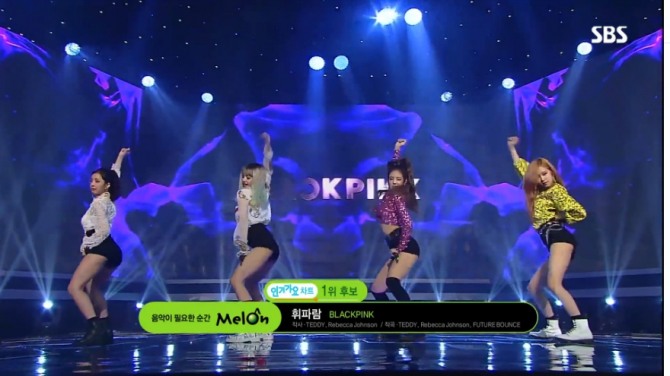 이미지 확대보기21일 오후 방송된 SBS TV 음악프로그램 '인기가요'에 출연한 블랙핑크는 데뷔 싱글앨범 '스퀘어원'(SQUARE ONE)의 더블 타이틀곡 '휘파람'으로 1위를 차지했다.