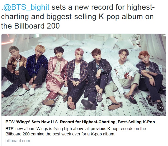 이날 빌보드는 '방탄소년단의 '윙스'가 한국 앨범 최고 판매량과 차트 최고 성적으로 미국의 새로운 기록을 세우다'란 제목의 칼럼을 게재하며 방탄소년단을 축하했다.