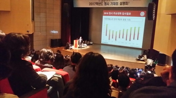 이미지 확대보기입시 전문 업체들은 2017학년도 수능 등급커트라인을 감안, 대학입시 정시모집에서 서울대, 연세대, 고려대 등 서울 주요대학 인기학과에 지원하려면 수학능력시험 원점수 기준으로 인문계는 380점대 중반, 자연계는 380점대 후반은 돼야 할 것으로 전망했다.