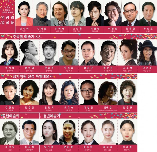 예술평론가협의회는 지난달 28일 심사를 거쳐 제36회 올해의 최우수예술가를 선정했다. 예술공헌, 무용, 문학, 미술, 연극, 영화, 음악, 예술평론, 전통 등에 걸친 이 상은 민간단체가 시상하는 권위 있는 상이다. 여러 단체의 수범(秀範)이 되는 예술평론가협의회는 1980년 창립 이래 매년 장르별 최우수예술가를 선정해 오고 있다.