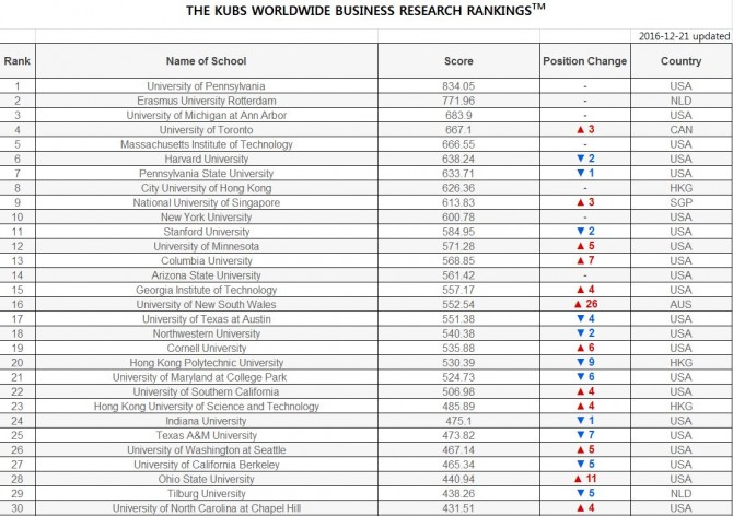 KUBS 랭킹은 86개 경영학 저널에 게재된 4만여 개 논문을 분석해 세계 경영대학의 연구역량을 확인할 수 있는 평가 지표다로 매년 가을에 발표한다. 종합 지표인 세계 랭킹은 물론, 학문 분야별 랭킹과 저널별 랭킹으로도 대학별 순위를 확인할 수 있다. 학문 분야는 △Accounting △Finance △Management △Management Information System(MIS) △Marketing △Operations Management & Management Science(OM/MS) △International Business(IB) & Strategy 등 7개로 나뉜다.