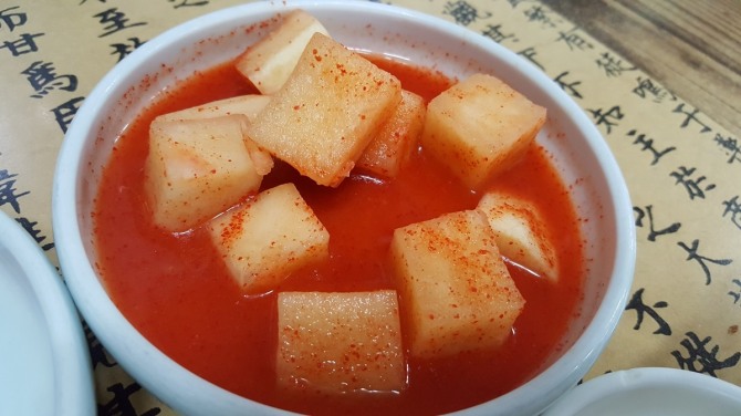 은희네해장국의 반찬은 깍두기와 김치 그리고 풋고추가 전부다. 깍두기의 시원하면서 아삭한 맛이 해장국의 맛을 북돋워 준다.