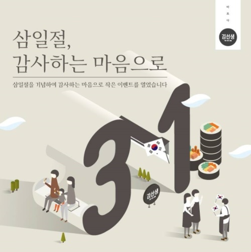 바르다김선생이 3.1절을 맞아 SNS를 활용한 ‘대한독립만세’ 이벤트를 마련했다. 이번 행사는 독립운동가들의 숭고한 희생정신을 되새기고 감사의 마음을 간직하고자 기획됐다. 참여 방법은 공식 SNS에 올라와 있는 이벤트 페이지에 댓글로 “대한독립만세! 감사합니다!”를 올리면 된다. 추첨을 통해 10명의 고객들에게 바른김밥 교환권을 증정한다.