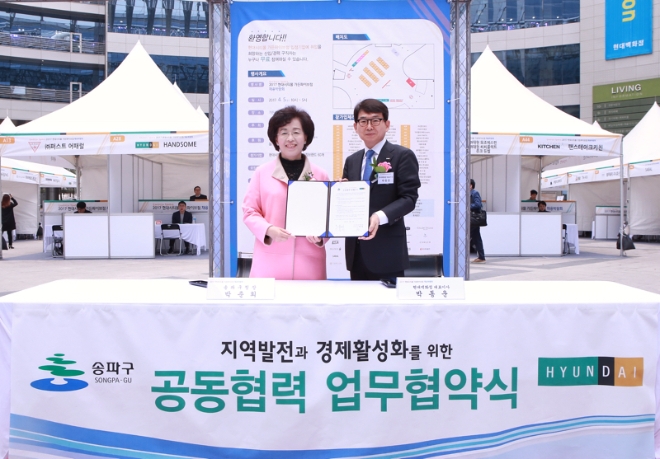 현대백화점은 송파구청과 지역발전과 경제활성화 위한 공동 협력 업무협약을 체결했다고 5일 밝혔다. 협약식은 이날 오전 '현대시티아울렛 가든파이브점(가칭)'이 들어설 가든파이브 1층 중앙광장에서 박동운 현대백화점 사장과 박춘희 송파구청장, 남인순 국회의원(서울 송파구병), 변창흠 SH서울주택도시공사 사장 등이 참석한 가운데 진행됐다. ▲지역주민 채용확대 등 일자리 창출 ▲송파구 취약계층 복지지원 등 사회공헌 활동 ▲기업의 우수인재 확보 지원 등에 대해 상호 협력하기로 했다.