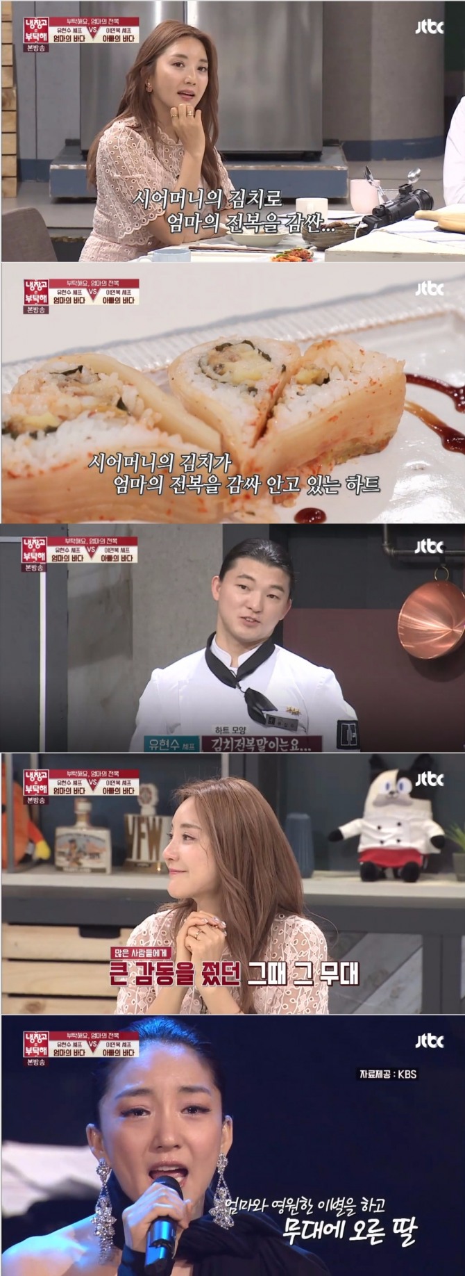또 접시 가장자리에는 '유 레이즈 미 업'(You raise me up)이라는 문구까지 새겨져 있었다. 바다는 "몇년 전 어머니께서 돌아가셨다. 3일장을 치른 후 '열린 음악회' 무대에 올랐을 때 부른 노래다. 이미 약속이 다 되어 있어서 영정 사진 앞에서 울지도 못하고 이 노래를 연습했다"며 북받친 감정을 드러냈다. 이에 유현수 셰프는 "그 때 저도 노래를 들었다.너무 감동적이었다"라고 전했다.