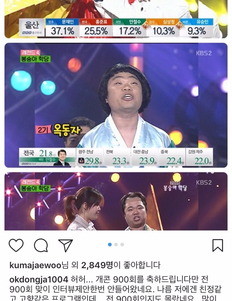 이미지 확대보기정종철은 “개콘 900회에 인터뷰 제의 한번 들어오지 않았다. 나름 친정 같은 프로그램인데…아쉽고 서운한 마음”이라며 자신의 심경을 전했다.