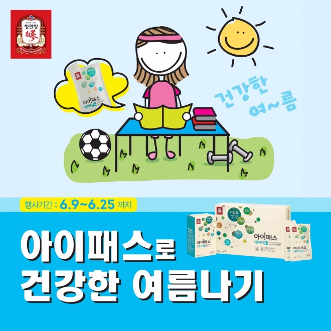 KGC인삼공사는 다가오는 여름을 대비해 우리 아이의 건강을 챙길 수 있도록 ‘아이패스로 건강한 여름나기’ 이벤트를 마련했다. 청소년용 홍삼 제품인 아이패스 제품류(J, M, H, 파워) 구매 시 ‘아이패스 파워’ 3병을 추가 증정한다. ‘아이패스’는 청소년용 홍삼 제품으로, 성장기 자녀를 위한 '주니어(J)', 청소년을 위한 '엠(M)', 수험생 체력관리를 위한 '에이치(H)' 등 연령대에 맞춘 다양한 제품으로 구성됐다. 이번 행사는 오는 25일까지 전국 정관장 매장에서 진행되며 ‘화애락’, ‘동인비’, ‘굿베이스’, ‘봉밀절편’ 등 구매 시 다양한 혜택을 제공하는 행사도 함께 진행된다.