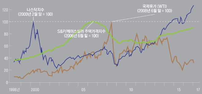 니혼게이자이는 세계 증권시장의 거품으로 미국 기술주를 상징하는 ‘나스닥지수’와 미국 20개 주요 도시의 집값을 산출하는 ‘S&P/케이스실러 주택가격지수’, 신흥국 경제 붐과 상품시장의 과열을 나타내는 국제유가(WTI, 서부텍사스원유) 가격을 들며 “나스닥지수는 2000년, 미국의 주택은 2006년, 국제유가는 2008년을 정점으로 정점을 찍고 떨어지는 산 모양의 곡선 그래프를 그리고 있다”고 분석했다.