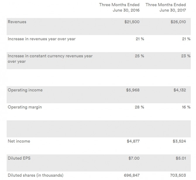 "With revenues of $26 billion, up 21% versus the second quarter of 2016 and 23% on a constant currency basis, we're delivering strong growth with great underlying momentum, while continuing to make focused investments in new revenue streams," said Ruth Porat, CFO of Alphabet.