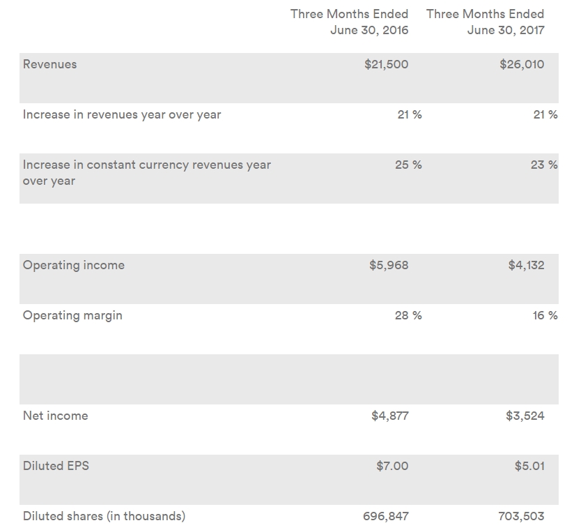 The following summarizes our consolidated financial results for the quarters ended June 30, 2016 and 2017 (in millions, except for per share information, effective tax rate, and headcount; unaudited), reported on a GAAP basis including the impact of the EC fine: