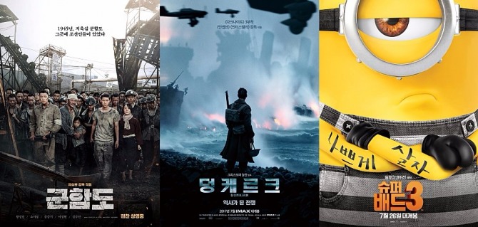 이에 가장 최근(7월 23일~7월 29일) 개봉해 현재 상영중인 영화는 ‘군함도’ ‘슈퍼배드3’ ‘송투송’ 등 3편이다.