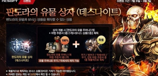 상자를 열면 판도라의 유물 주머니 1개와 인챈트 스테이터스, 블레즈드 아머, 디크리즈 웨이트 마법 주문서를 각각 2개씩 확정적으로 얻을 수 있다. 데스나이트의 부츠‧투구‧장갑‧갑옷 등 일명 ‘데스셋’과 데스나티의 불검 등 아이템은 확률적으로 나온다.