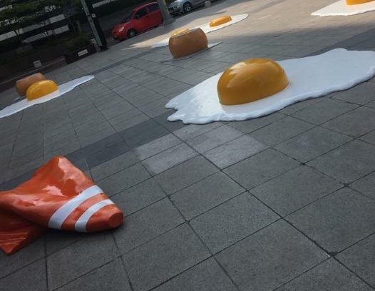 이미지 확대보기대구 현대백화점 앞 대프리카 조형물. 대구의 뜨거운 날씨에 계란과 꼬깔이 녹아내린 모습을 표현한 조형물이 설치돼 있다. 대구는 6일 39도를 넘어섰다. 페이스북 실시간 대구 캡쳐