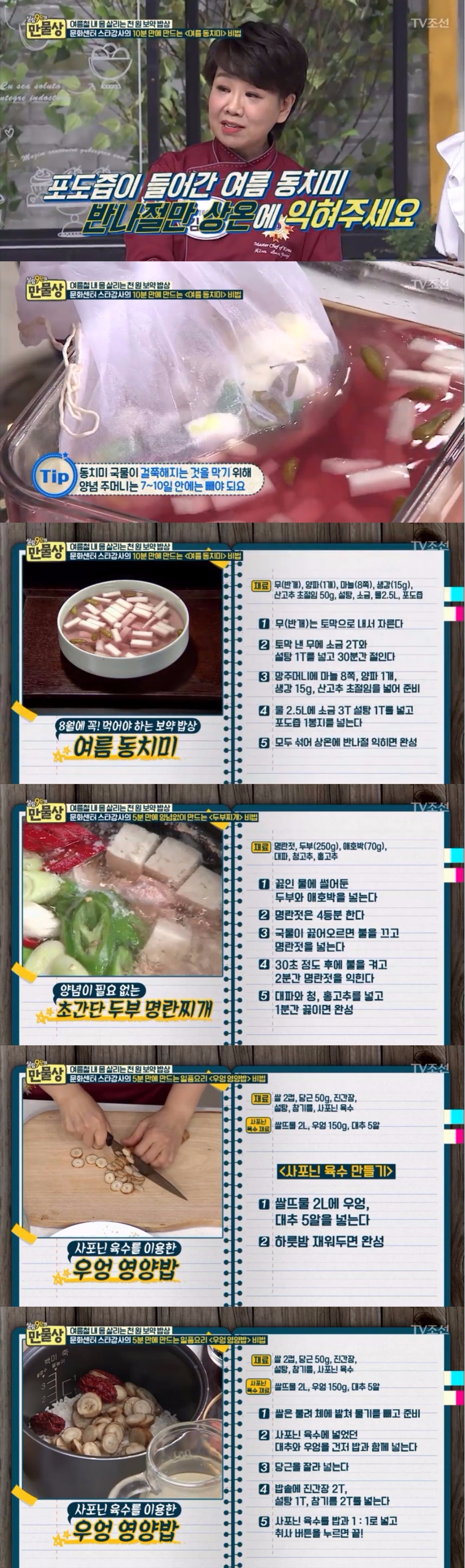 이날 '문화센터 스타강사의 1000원 보약 밥상'으로 김선영 요리연구가는 20년 강의에서 가장 인기가 있었던 반찬 세 가지를 공개했다. 김씨는 무, 우엉, 두부를 이용한 초간단 요리로 여름동치미, 우엉영양밥, 두부명란찌개를 선보였다.