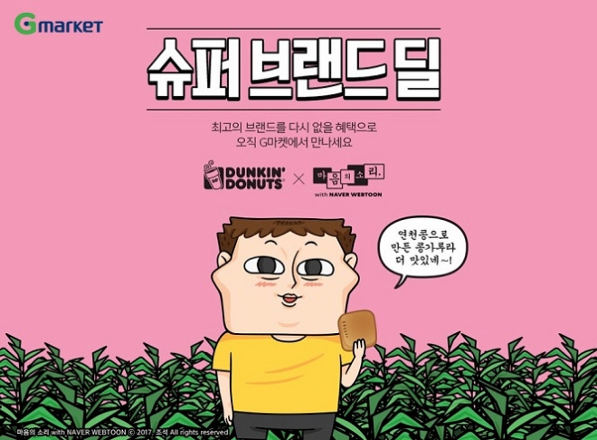 온라인쇼핑사이트 G마켓은 오는 24일까지 ‘던킨도너츠 슈퍼브랜드딜’을 열고, ‘마음은 콩 밭에’ 도넛 등 신제품 4종을 50% 할인가에 판매한다. 행사 기념으로 인기 웹툰인 ‘마음의소리’와 콜라보레이션한 웹툰도 감상할 수 있다. 해당 제품은 연천 콩으로 만든 도넛 3종과 미숫가루 음료 1종으로 구성돼 있다. '마음은 콩 밭에'는 콩고물을 듬뿍 묻힌 도넛이고, '소문이 쑥덕쑥덕'과 '마음이 콩닥콩닥'은 쫄깃한 반죽에 콩고물이 올라가 있는 츄이볼 도넛이다. '소문이 쑥덕쑥덕'은 반죽에 '쑥'을 넣어 향긋한 맛을 더한 것이 특징이다. ‘미숫치노’는 가벼운 스무디 타입의 미숫가루 음료다. 슈퍼브랜드딜에서는 ’마음은 콩밭에’와 ‘미숫치노’를 함께 즐길 수 있는 패키지 상품을 50% 할인된 2200원에, ‘소문이 쑥덕쑥덕’과 ‘마음이 콩닥콩닥’ 4개 패키지 상품도 절반 가격인 단돈 1000원에 선보인다.