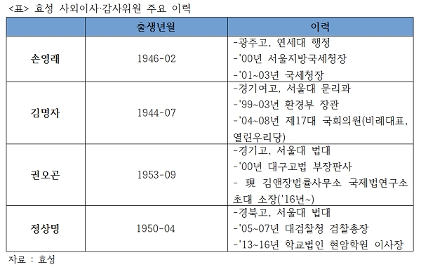 이에 따라 효성은 손영래 전 국세청장과 김명자 전 환경부 장관, 권오곤 전 부장판사, 정상명 전 검찰총장을 사외이사 겸 감사위원 후보로, 최중경 전 기획재정부 장관을 감사위원 후보로 선정했다. 이상운 사내이사 후보는 중도 사퇴했다.
