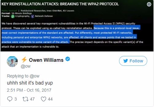 해커가 목표로 삼은 와이파이 네트워크를 도용하고 도청하는 것이 얼마나 쉬운지는 아직 명확하게 알려지지 않았다. 하지만 11월 1일에 공식적으로 발표될 취약점이 웹사이트(krackattacks.com)를 통해 오늘 공개될 예정이다.