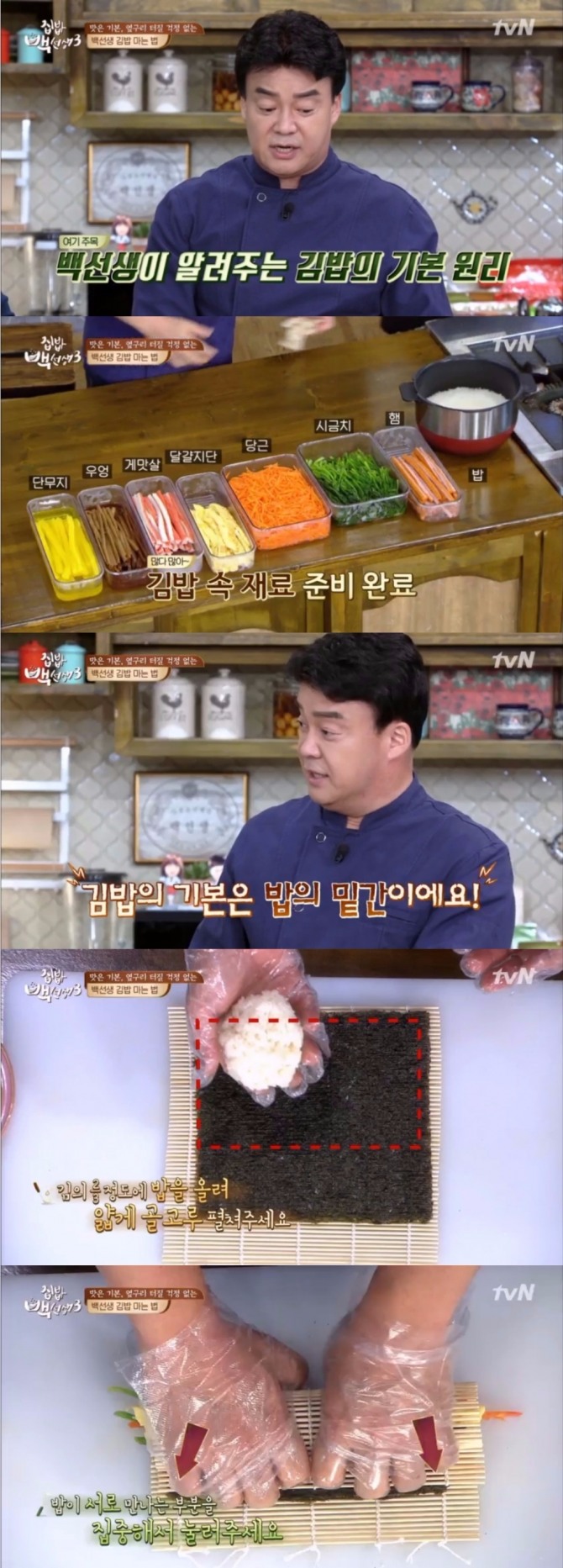 이날 백종원은 원포인트 김밥에 앞서 김밥의 원리를 설명하기 위해 기본김밥 싸는 법을 먼저 설명했다.