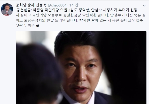 수억원의 공천헌금을 받은 혐의로 기소된 국민의당 박준영 의원이 항소심에서도 당선무효 기준에 해당하는 실형을 선고받은 가운데 이를 두고 공화당 신동욱 총재가 27일 트위터 글을 남겼다. 사진=신동욱 트위터