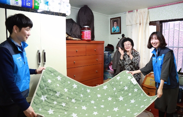 애경산업은 29일 독거 어르신 가정을 방문해 겨울철 방한 필수용품인 전기요를 전달했다. 이번 겨울철 방한용품 전달은 애경산업이 6년째 본사 각 팀 별로 소외계층 노인가정과 1대1 결연을 맺고 해당가정을 후원하는 밀착형 봉사활동 ‘희망디딤돌’의 일환으로 마련됐다.