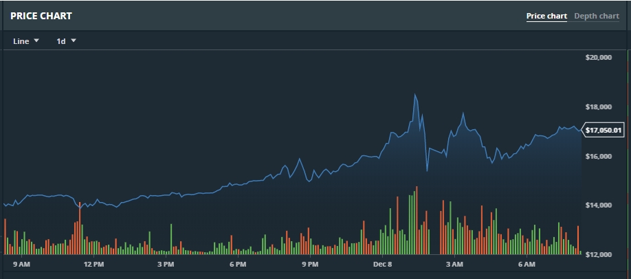 또 다른 가상화폐 거래소인 코인베이스에서는 비트코인 가격이 이날 장중 한때 1만9000 달러를 돌파하기도 했다. 이날 비트코인은 1만5000달러를 넘는 선에서 거래를 시작한 뒤 면서 1만6000 달러 선, 1만7000 달러선, 1만8000달러 선을 차례로 돌파한 뒤 급기야 1만9000 달러선도 상회했다. 비트코인 시세는 그러나 1만9000달러 돌파 직후 그동안의 과열에 대한 우려가 나오면서 급락세로 돌아섰다.