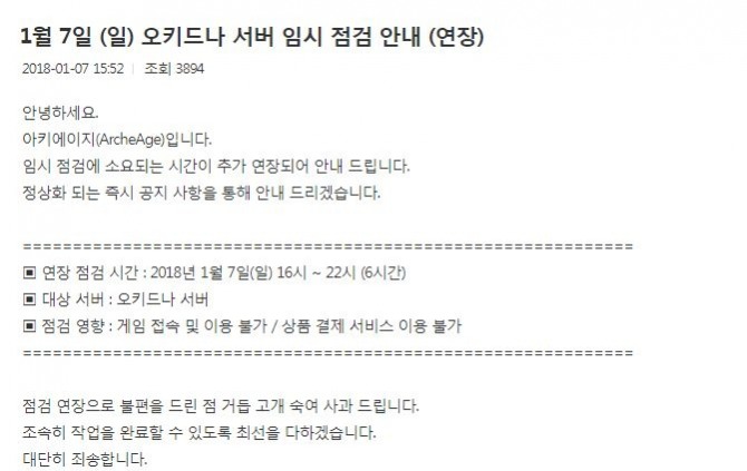 이미지 확대보기이날 오후 4시경 엑스엘게임즈는 아키에이지 홈페이지를 통해 오키드나 서버 점검이 오후 10시까지 연장된다고 알렸다.