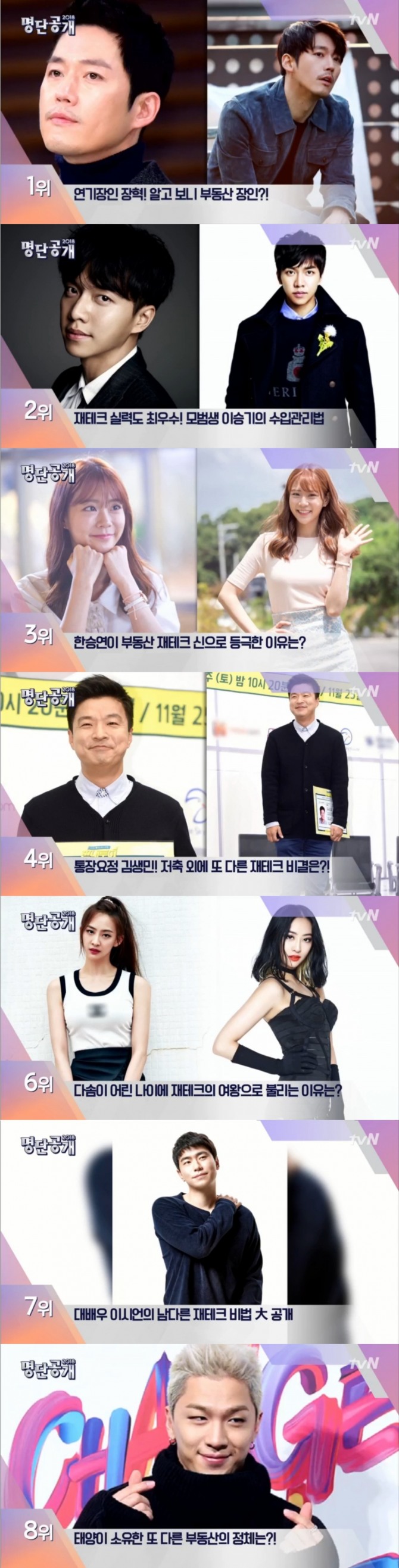 이미지 확대보기16일 새벽 방송된 tvN '명단공개 2018'(이하 '명단공개')에서는 '본업만큼 투자도 대박!재테크 금손 스타' 순위가 공개된 가운데 장혁이 1위에 올랐다.