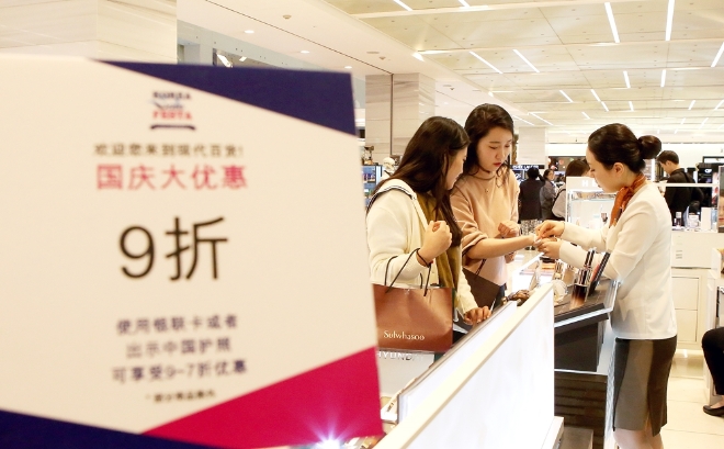 현대백화점은 외국인 대상 쇼핑 문화 관광 축제인 ‘코리아 그랜드 세일 기간(1/18~2/28)’ 춘제(春節)를 맞아 한국을 찾는 중국인 관광객을 대상으로 할인 행사와 사은품 증정 등의 다양한 프로모션을 진행한다고 17일 밝혔다. 대상 점포는 현대백화점 압구정본점·무역센터점·신촌점·판교점·디큐브시티 등 5개 백화점과 현대시티아울렛 동대문점·가산점 등 총 7개 점포다. 현대백화점은 우선 중국인들이 선호하는 200여 개 브랜드를 선별해 10~40% 할인 혜택을 제공한다. 현대백화점은 이미 중국 최대 신용카드사인 ‘은련카드’와 업무 제휴를 통해 업계에선 유일하게 중국인 관광객이 은련카드로 결제시 상시 5% 할인 혜택과 5% 마일리지 적립행사도 상시적으로 진행하고 있다.