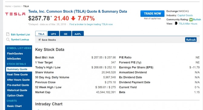한국시간 29일 미국 뉴욕증시에 따르면 이날 테슬라의 주가는 257.78달러로 마감됐다. 전일 대비 21.40포인트, 비율로는 7.67% 하락한 것이다.