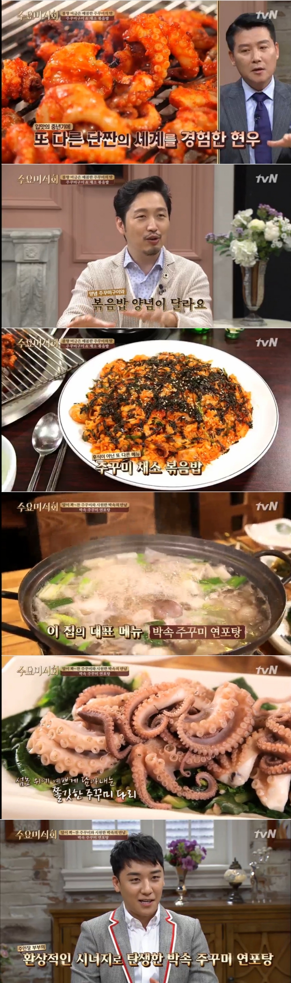 이미지 확대보기28일 밤 방송된 tvN '수요미식회' 163회에서는 봄 제철 식품인 주꾸미 요리를 주제로 빅뱅 승리, 신동헌 칼럼리스트가 스페셜 게스트로 출연한 가운데 주꾸미구이&채소볶음밥과 박속주꾸미연포탕을 소개했다.