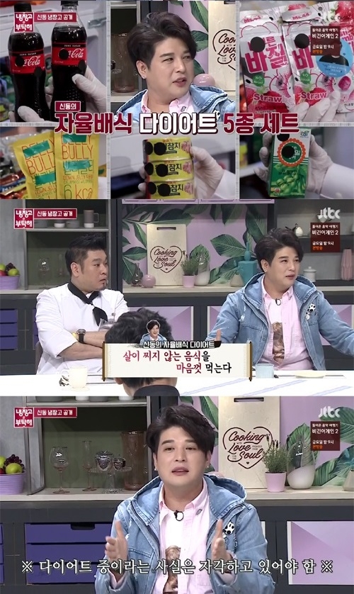 신동은 '자율배식 다이어트' 음식 다섯 가지로 두유, 참치, 깔라만시 젤리, 바질 캔디 그리고 제로칼로리 콜라를 꼽았다.