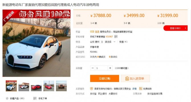 中온라인 쇼핑몰서 부가티·람보르기니 전기 짝퉁차 판매...누리꾼들 "어이없다"