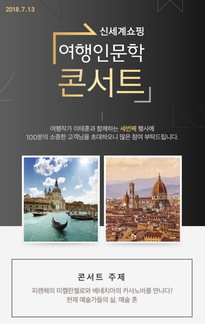 이미지 확대보기신세계TV쇼핑은 오는 13일 세 번째 '여행 인문학 콘서트'를 개최한다고 밝혔다. ‘여행 인문학 콘서트’는 유럽여행을 떠나거나, 유럽여행에 관심이 있는 고객들을 대상으로 진행되는 오프라인 강연이다. 선착순 100명 한정으로 참석할 수 있다. 상품 판매 페이지에서 상담 신청만 남기면 누구나 강연을 들을 수 있다.
