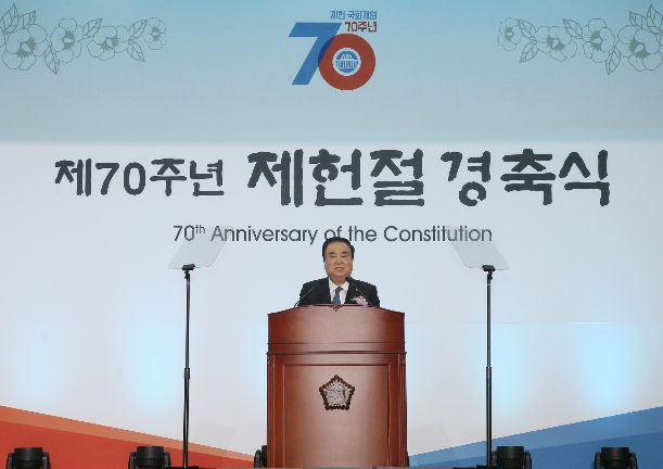 이미지 확대보기문 의장은 지난 17일 국회에서 열린 제70주년 제헌절 경축사에서 “오늘 제70주년 제헌절은 새로운 헌법과 함께 맞이하길 기대했으나, 매우 안타까운 현실이 아닐 수 없습니다”라며 “그럼에도 불구하고 국민의 80%는 개헌을 재추진해야 한다고 말하고 있다”고 말했다.