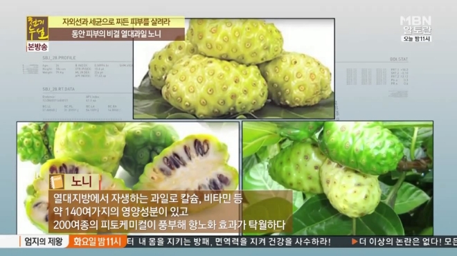 노니를 향한 대중의 관심이 뜨겁다. 노니는 칼슘, 비타민 등이 풍부하고 약 200여 종의 식물영양소가 들어있어 천연 항산화제로 불린다.피부 노화 예방에 매우 효과적이다. 사진=방송화면