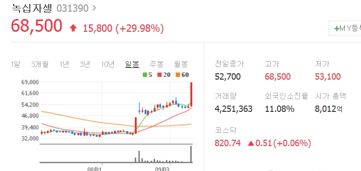 녹십자셀은 오후 2시 43분 현재 상한가를 기록하고 있다.