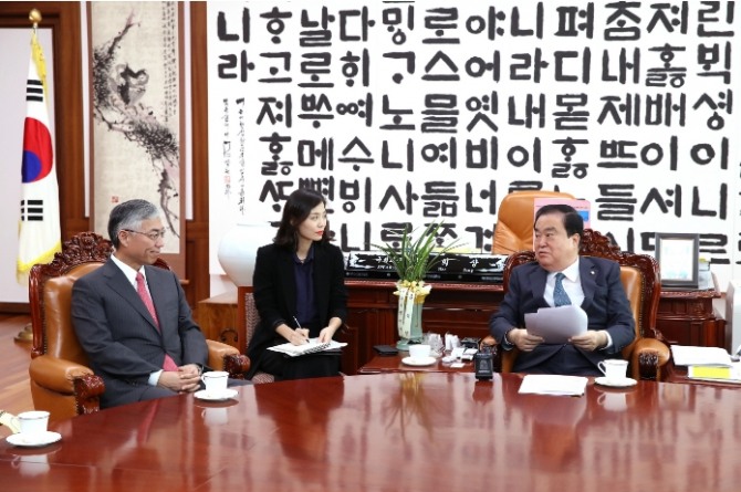 문희상 국회의장이 27일 오전 의장집무실에서 추 궈훙(邱國洪, Qiu Guohong) 주한중국대사 예방을 받고 있다=국회 의장실 제공