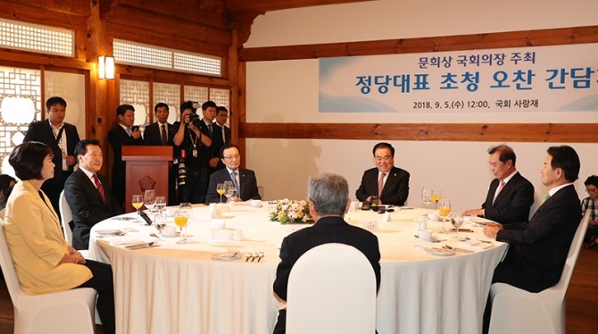 지난달 5일 국회 사랑재에서 문의장과 여야 5당 대표 그리고 유인태 국회사무총장이 오찬 회동을 갖고 있다=더불어민주당 제공