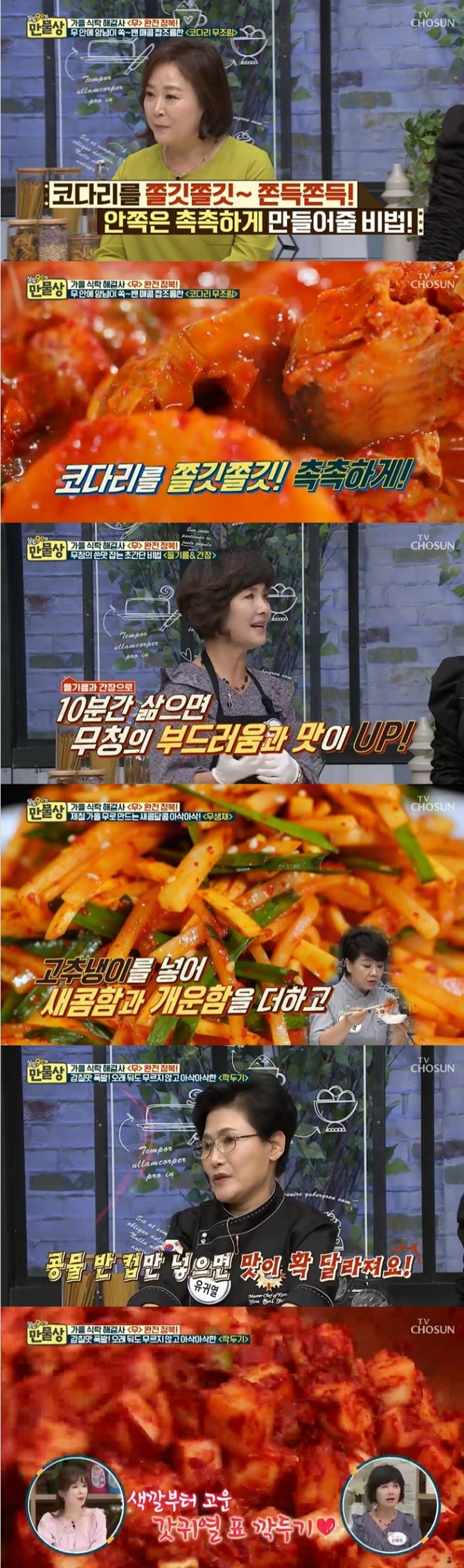 지난 4일 방송된 TV CHOSUN '살림9단의 만물상' 263회에서는 '가을 식탁 해결사 <무> 완전정복' 특집편으로 이보은 요리연구가, 연예인 요리 고수 김혜정, 유귀열 조리기능장이 출연, 가을 제철 무로 만든 '코다리무조림', '무장아찌', '무청돼지고기찜', '무생채', '깍두기', '오징어무볶음' 만드는 법을 선보였다. 사진=TV CHOSUN 방송 캡처