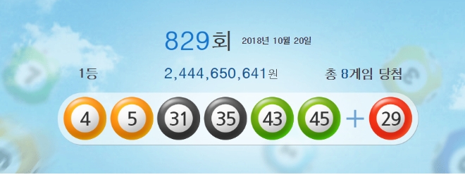 나눔로또는 20일 제829회 로또 1등 당첨번호가 4, 5, 31, 35, 43, 45라고 밝혔다. 2등 보너스번호는 29다. 1등 8명은 각각 약 24억4466만원을 가져가게 됐다. 2등 45명은 약 7243만원, 3등 1837명은 약 117만원을 받는다.