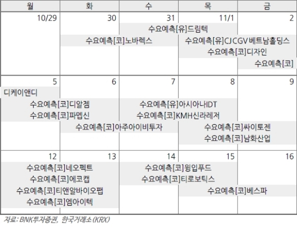 이미지 확대보기BNK투자증권에 따르면 11월 IPO의 막바지단계인 수요예측이 집중되어 있다. 수요예측의 평균기업수는 첫째주 4.5개, 둘째주 7.5개, 세째주 7개에 달한다. 평균적으로 수요예측이 주간 1~2개가 진행되는 것을 감안하면 압도적인 숫자다.