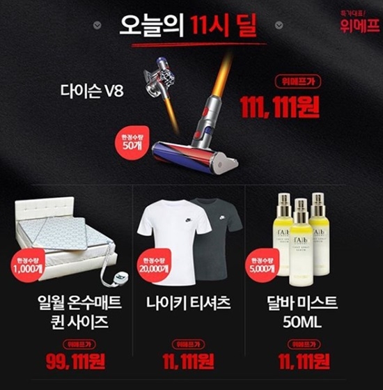 위메프는 1일부터 매일 오전·오후 11시에 인기 브랜드 상품을 초특가에 판매하는 '블랙1111데이'를 진행하고 있다.