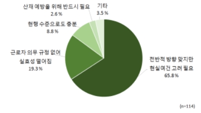 한국경제연구원이 산업안전보건법 개정안과 관련해 주요 대기업을 대상으로 조사한 결과(114개사 응답), ‘전반적인 방향성은 맞지만 현실 여건에 대한 고려가 필요하다’는 답변이 65.8%로 가장 많았다고 11일 밝혔다. ‘근로자의 의무 규정이 없어 실효성이 떨어진다’(19.3%)와 ‘현행 수준으로도 충분하다’(8.8%)가 그 뒤를 이었고, ‘산재예방을 위해 반드시 필요하다’는 응답은 2.6%에 불과했다.