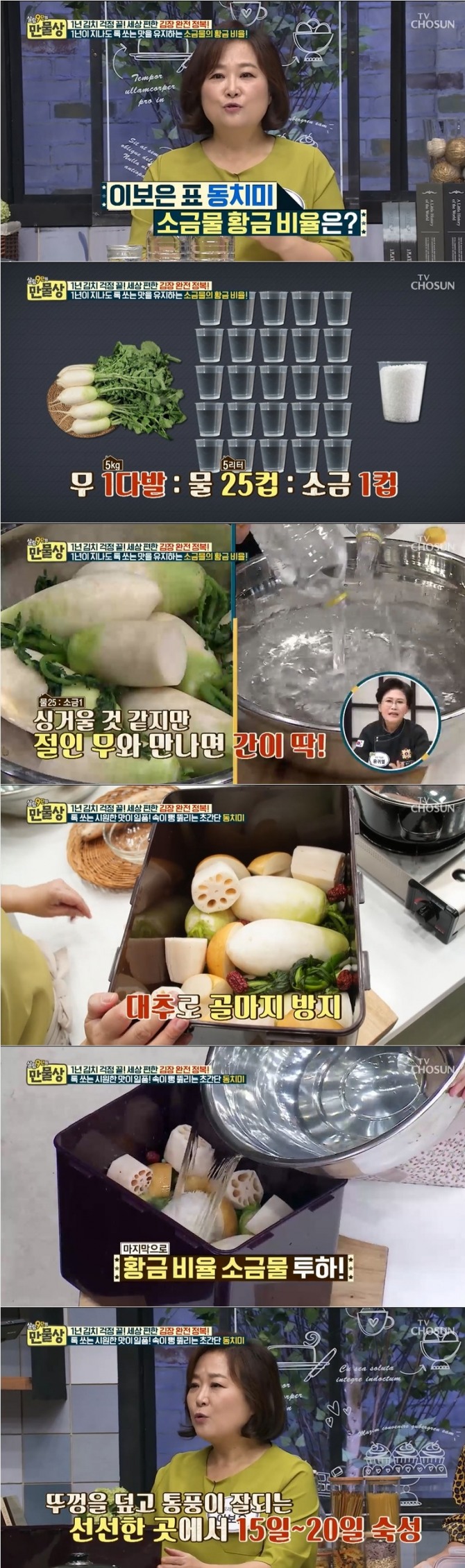 이날 이보은 씨는 톡 쏘는 동치미 국물 맛 황금비율은 무 한 다발(5kg)을 기준으로 잡았을 때 물 25컵(5L)에 소금 1컵이라고 밝혔다. 무를 절였기 때문에 25:1의 비율로 소금을 넣어도 동치미가 싱겁지 않다.