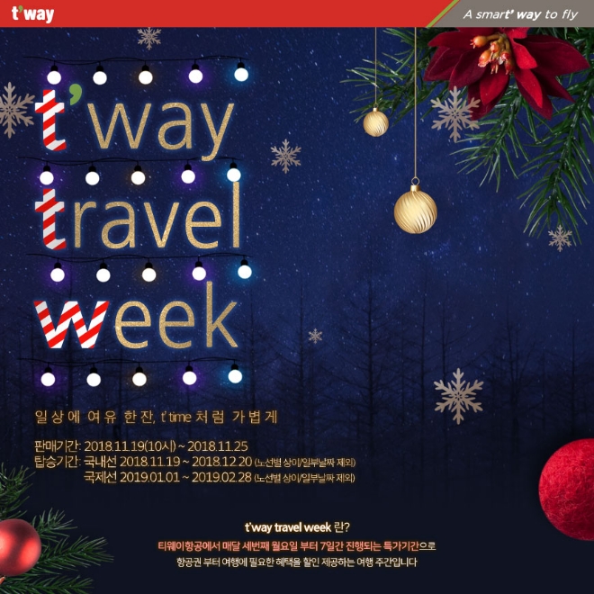 한편 티웨이항공은 매달 세 번째 월요일부터 시작되는 합리적인 운임의 여행 주간, 't'way travel week(티웨이 트래블 위크)'를 시행하고 있다.