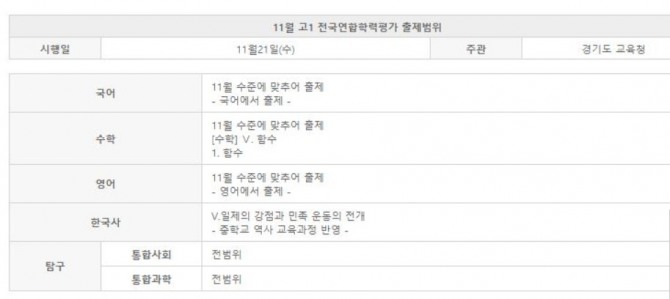 경기도교육청 주관으로 21일 실시되는 11월 모의고사 시행영역 및 과목은 국어, 수학, 영어, 탐구, 한국사 필수에 제2외국어만 학년별로 다르다.