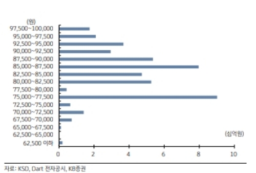 한편 현대차 주가가 추가적으로 하락하더라도 본격적인 녹인상황에 진입하지 않을 것이라는 게 KB증권의 분석이다. KI 베리어별 매물규모를 보면 7만5000원~7만7500원 사이에 90억원 이상, 8만5000원~8만7500원 사이 80억원 이상으로 추정된다.