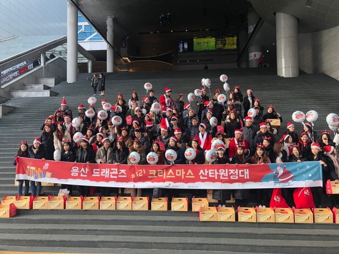 오후 2시께 서울 용산역 광장 앞. 아모레퍼시픽과 CJ CGV, HDC신라면세점, 삼일회계법인 등 직원은 구세군 종소리와 함께 본격적으로 봉사활동 시작에 앞서 준비를 시작했다. 행사 관계자가 산타 복장과 머리띠를 건네줬다. 행사 관계자는 "오늘만큼은 크리스마스 산타가 돼 용산 인근 6개 사회복지시설 어린이들을 대상으로 따뜻한 마음을 나눠보자"라며 용기를 북돋아 줬다.