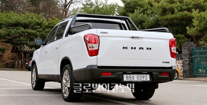 렉스턴 칸의 후면 역시 단순하고, 데크에 렉스턴 스포츠 칸 뱃지와 큼지막한 ‘KHAN’ 로고가 차량의 정체성을 암시하고 있다.